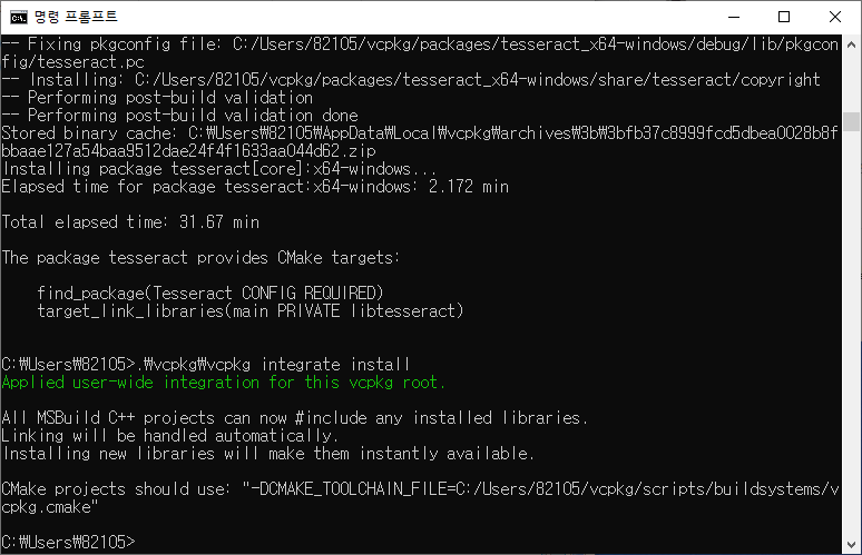 Visual Studio에서 vcpkg를 사용하기 위해 다음 명령을 실행합니다.