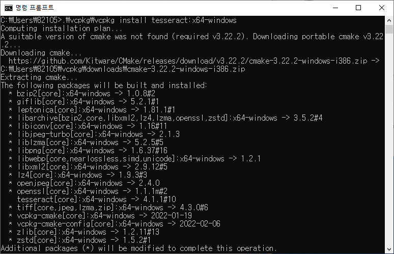 그 다음 tesseract 라이브러리를 설치합니다. 약 15분-30분 정도 걸립니다.