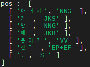 pos는 형태소로 나눈 것과 품사 태그가 같이 나왔다.