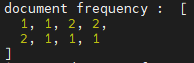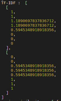 각 문서의 bow벡터(TF)를 get_idf에 넣으면 DF벡터를 구한 후 IDF벡터를 반환해준다. IDF 공식은 1+ln((1+N)/(1+DF))를 사용했다.