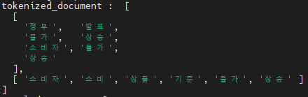 document를 tokenizer 함수에 넣으면, tokenizer 함수에서 mecab의 nounsSync를 실행한 결과를 반환해준다. document의 문장에서 명사만 추출된 모습을 확인할 수 있다.