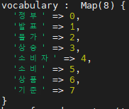 토큰화된 문서를 build_bag_of_words에 넣으면 단어사전인 vocab과 각 문서의 bow벡터 배열인 bow를 반환해준다. 여기선 TF와 BOW가 같은 벡터를 나타낸다. 전체 문서에 대한 단어사전과 각 문서의 bow(TF)벡터가 만들어진 것을 확인할 수 있다.