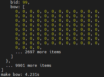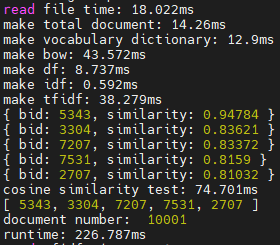 위의 사진과 같이 형태소 분석기 mecab이 한 문서를 토큰화하는데 걸리는 시간이 4~5ms 였다. 따라서 만개를 토큰화한다면 40~50초, 백만개를 토큰화한다면 4000~5000초가 걸리는 것이다. 토큰화할 때 고정적으로 소요되는 시간이 너무 컸기에, 제일 먼저 토큰화한 파일을 저장해야 겠다고 생각했다. 토큰화한 파일을 불러와서 tf-idf를 계산하는 것은 성공적이었다.